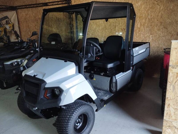 Equipée d'un pare-brise avec essui glace, benne basculante, grandes roues